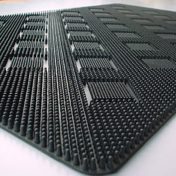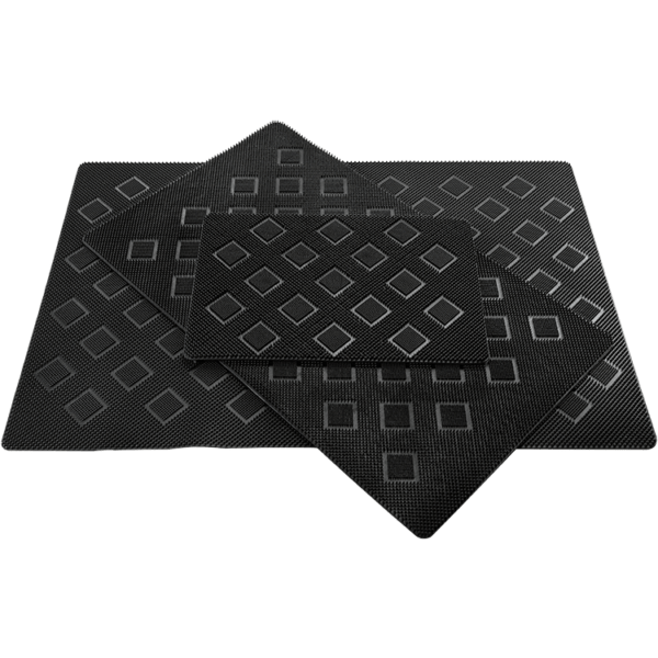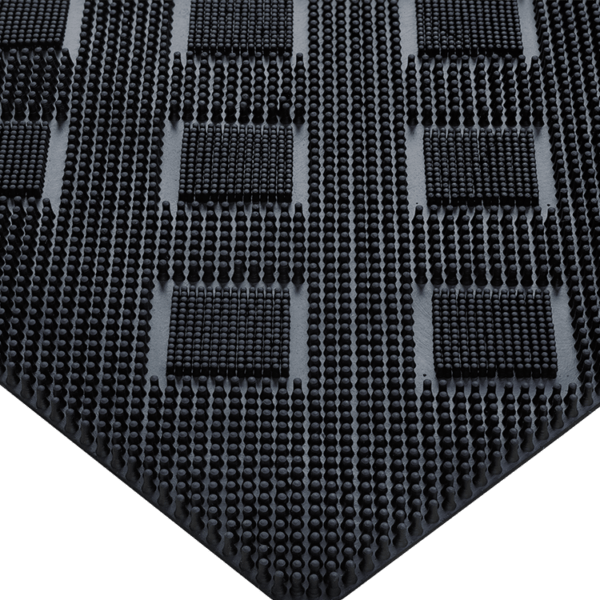 The square mat is a symmetrical designer class mat . The mat is highly durable and its unique square print design blends form with function. The differential level flexible studs ensure proper cleaning and compliments any decor.